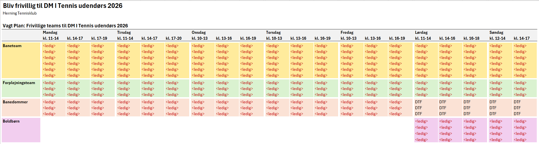 Skriv dit navn, telefonnummer og ønske om team og tid til admin@herningtennis.dk , så vil vagtplanen nedenfor blive opdateret med de valgte vagter.